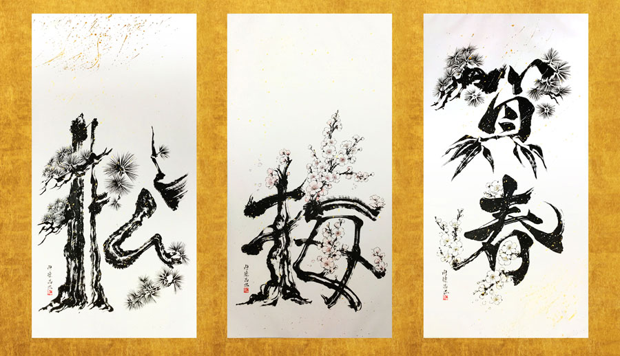 華道家矢田青幸氏との連携で「松竹梅」を書と生け花でコラボ制作しました!